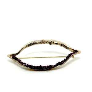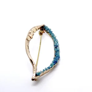 Η απόλυτη σχεδιαστική ένταση αποκαλύπτεται στην απέναντι πλευρά της καρφίτσας, η οποία λειτουργεί ως μια πολυτελής κοίτη, κατάμεστη από φυσικούς, ακατέργαστους κρυστάλλους. Δημιουργούν μια τραχιά, πολύτιμη υφή που αιχμαλωτίζει το φως, προσφέροντας διακριτικές, ζωντανές αντανακλάσεις που “φωτίζουν” κάθε ύφασμα και κολακεύουν το πρόσωπο.
