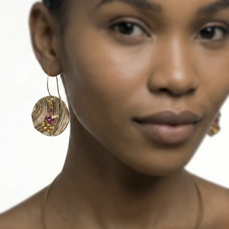 Προσθέστε μια πινελιά καλλιτεχνικής πολυτέλειας στην εμφάνισή σας με τα statement χειροποίητα σκουλαρίκια Ostrea S1203. Κατασκευασμένα από ορείχαλκο με χρωματιστή πατίνα, κοσμούνται από λαμπερούς κρυστάλλους. Διαθέτουν ασημένιο κούμπωμα 925 για απόλυτη ασφάλεια και άνεση. Είναι δουλεμένα εξ ολοκλήρου στο χέρι με την τεχνική του διαμανταρίσματος, η οποία χαρίζει στο μέταλλο την απόλυτη λάμψη. Με ιδανικό μέγεθος 4cm, αποτελούν ένα εντυπωσιακό κόσμημα με οργανική αισθητική, ικανό να φωτίσει το πρόσωπό σας.