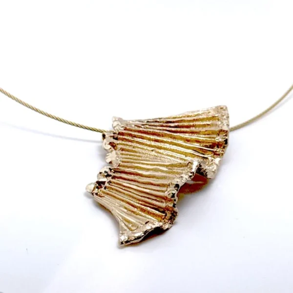 Το κολιέ Dark Romance K1141 Large είναι ένα εντυπωσιακό χειροποίητο κολιέ λαιμού, ιδανικό για ένα τολμηρό statement. Το κεντρικό κρεμαστό αποτελείται από ένα μεγάλο σύμπλεγμα από επικαλυπτόμενες πλάκες με έντονες κάθετες ραβδώσεις (πτυχώσεις), φτιαγμένο από ορείχαλκο. Το μοτίβο χαρακτηρίζεται από την πολυτονική έντονη πατίνα, που δημιουργεί μια ρευστή, αρχιτεκτονική αίσθηση. Είναι κομμένο με διαμάντι (Diamond Cut) για μέγιστη λάμψη.